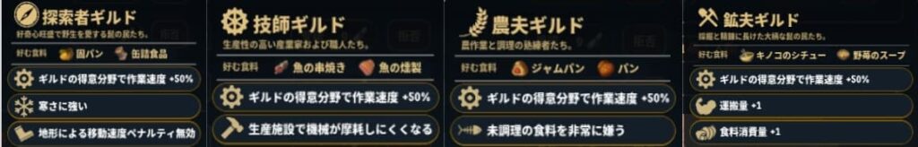 住民はそれぞれ4種類のギルドに属していて、それぞれ得意な作業や長所・短所が違います。