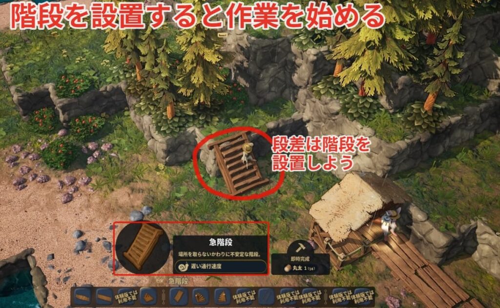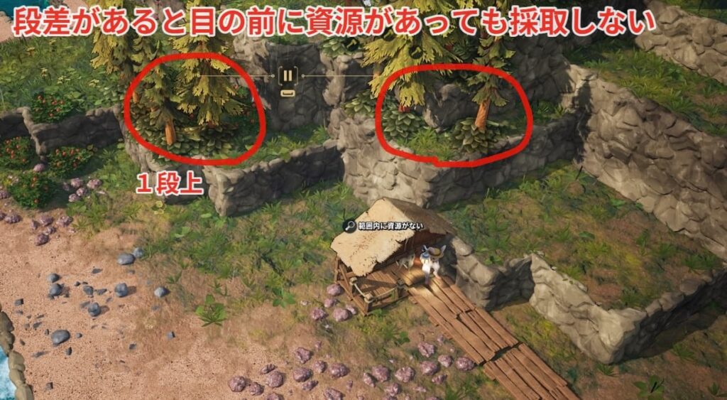 ウィスカーウッドには階層の概念があり、1段高いエリアの資源は何もない状態だと採取できません。