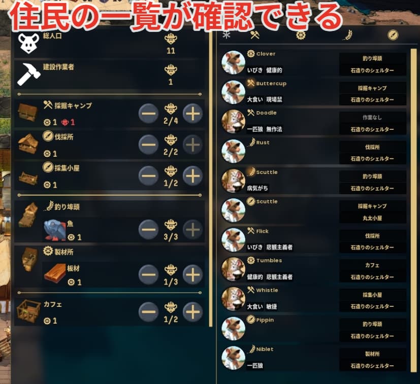 この画面で各住民の就いてる仕事や今していることを一目で確認できるので活用しましょう!