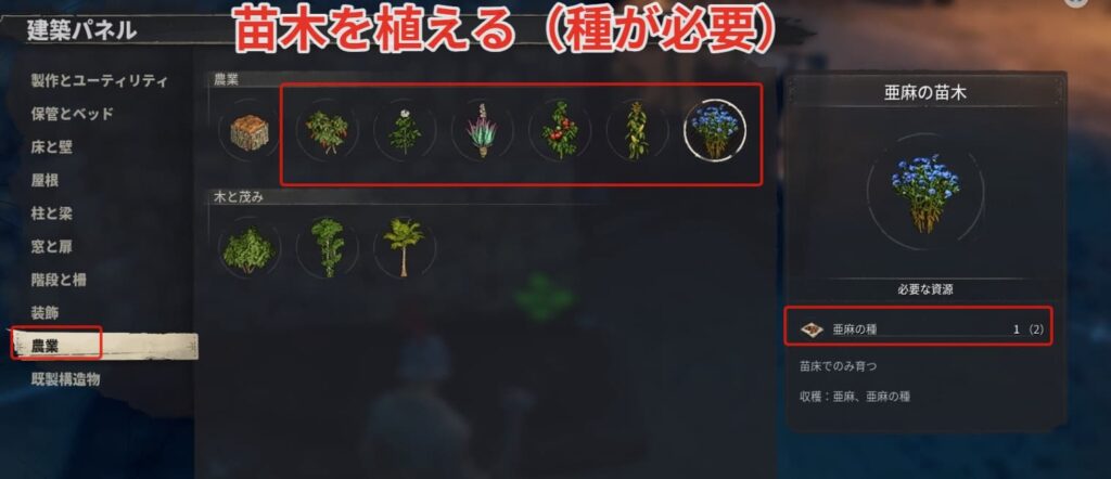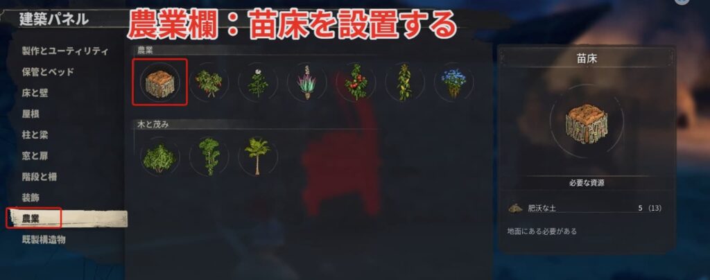 拠点に戻って農業の欄にある【苗床】を設置しましょう。