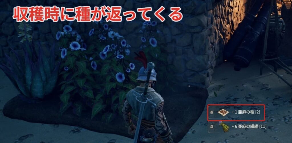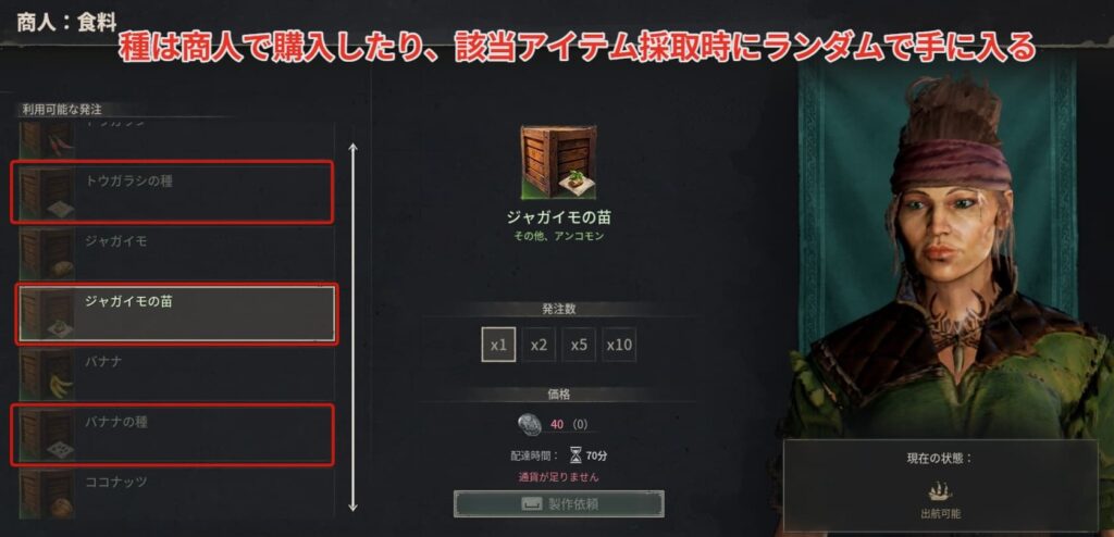 農業で必要な種は商人で購入したり、該当アイテムを探索時に採取した際にランダムで手に入ります。