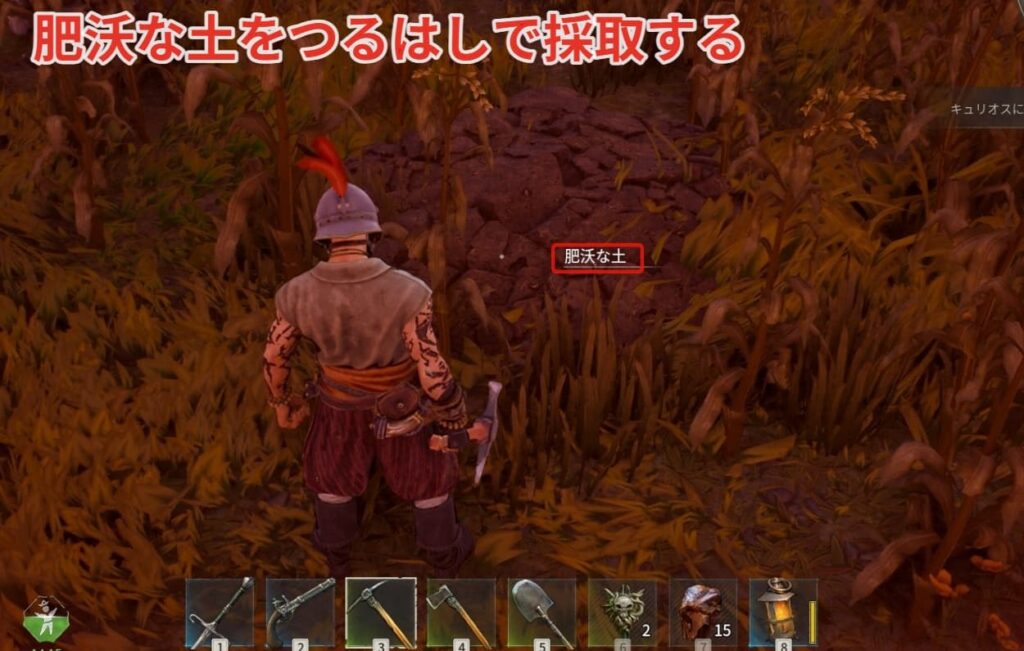 古代の農場に【肥沃な土】と呼ばれる農業に必須な土があるのでつるはしで採取しましょう。