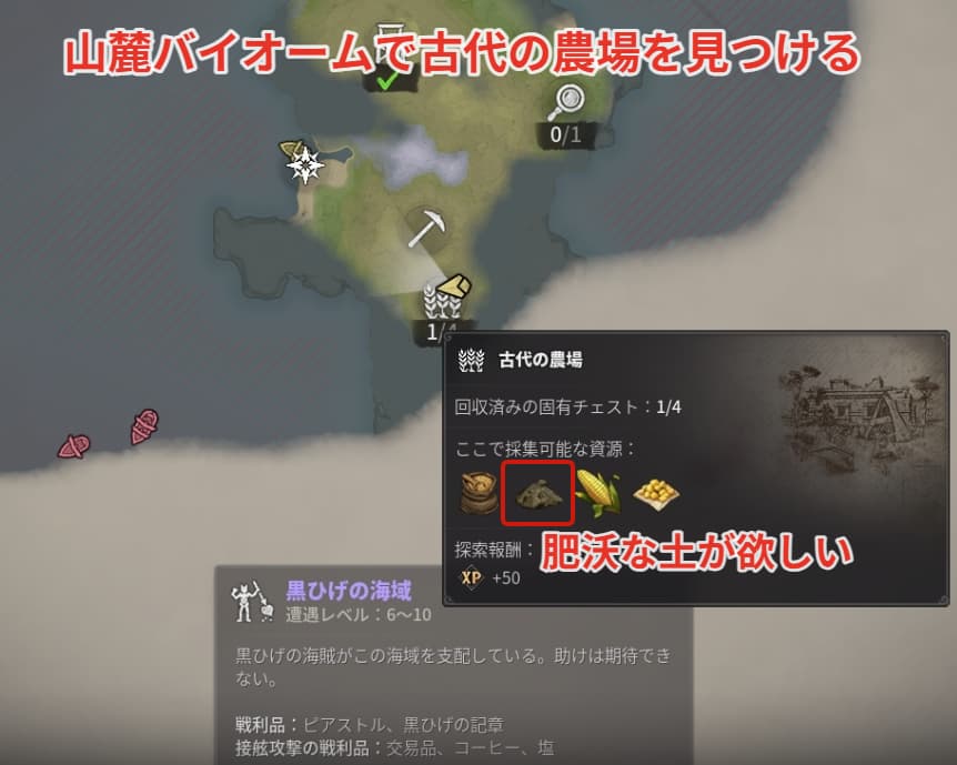 新しい山麓バイオームの島(遭遇レベル6~10の海域)まで進めたら古代の農場を見つけましょう。