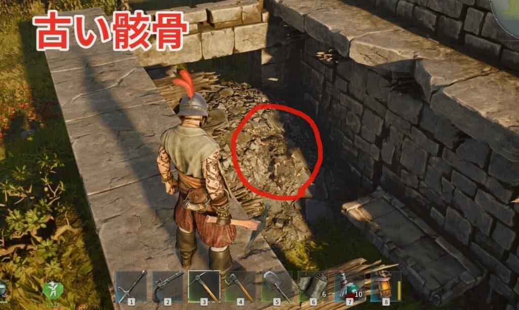 1カ所が小さいスペースのガレキに古い骸骨が転がっているので漁りましょう。