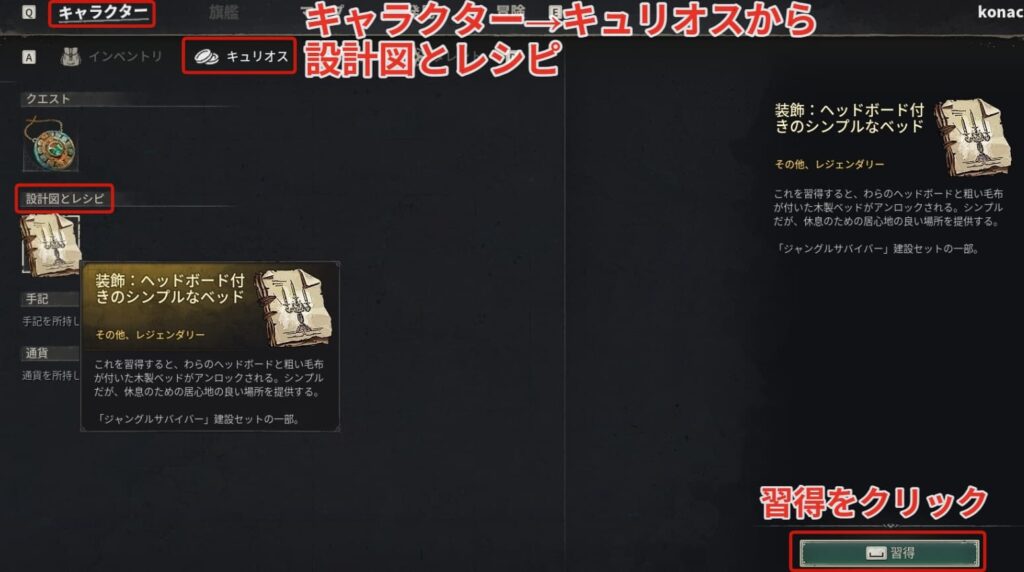 見つけた設計図とレシピはキャラクター→キュリオスにある設計図とレシピで選択後に右下の【習得】をクリックすることで覚えることができます。