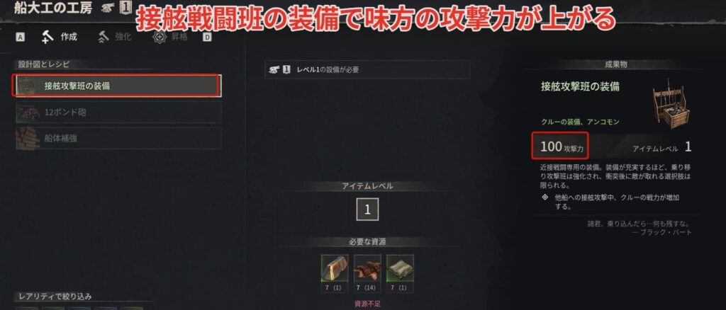 接舷戦闘時の味方の攻撃力を船大工の工房で初期から作成できる【接舷戦闘班の装備】で上げることが出来ます。