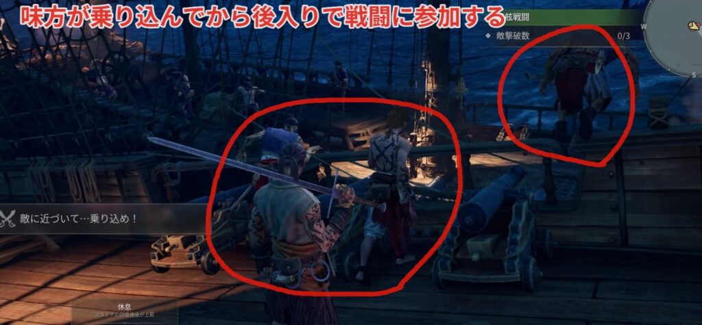 接舷開始を押してもすぐ味方のクルーは敵船に乗りこんでくれません。
