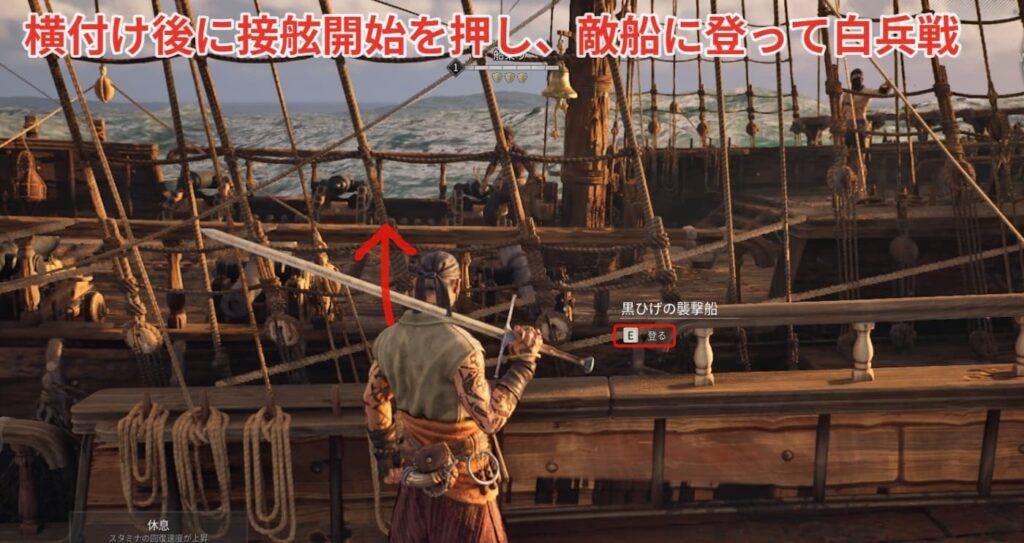 接舷開始を押し、敵船に登ることで白兵戦ができます。