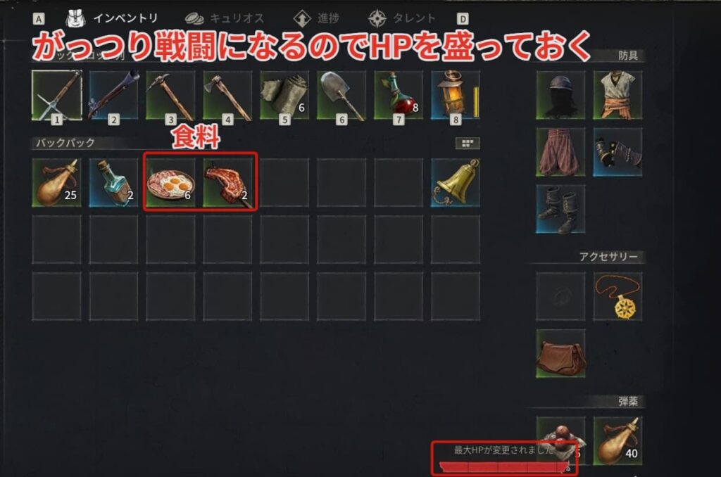 - ①食事をとって最大HPを増やしておく(船が狭い)