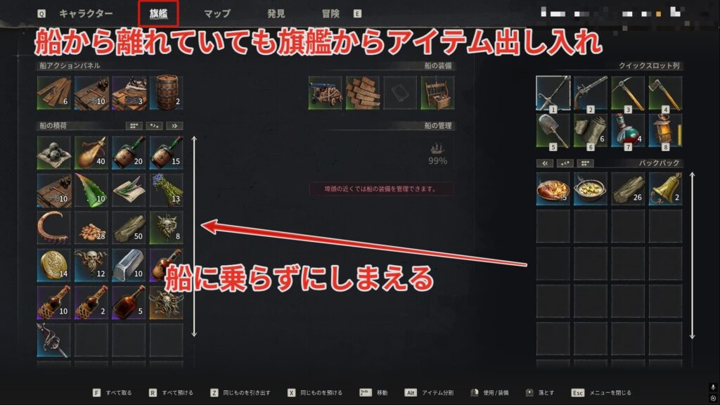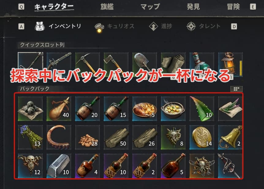 探索中にバックパックが一杯になったら一度船の積荷に逃がす方が多いと思います。