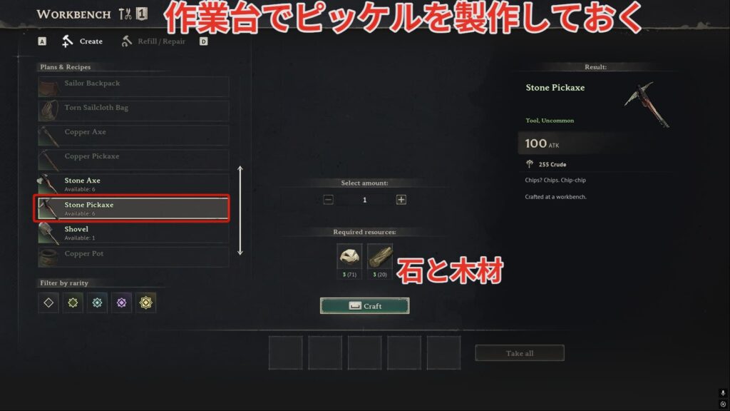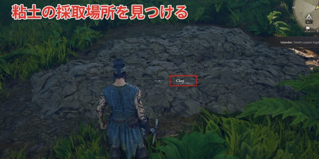 次に粘土の採取場所を見つけ、ピッケルで採取しましょう!