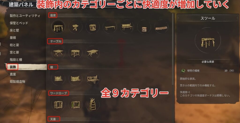 序盤で全9カテゴリーあったので全て設置すれば快適度10まで簡単に上げれます。(カテゴリーは後々増えるかも)