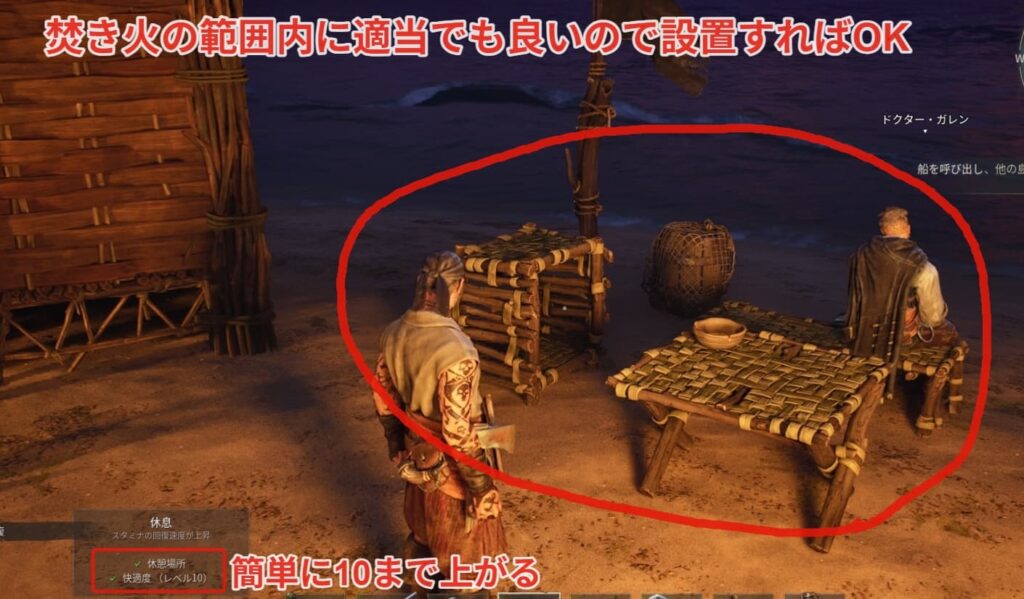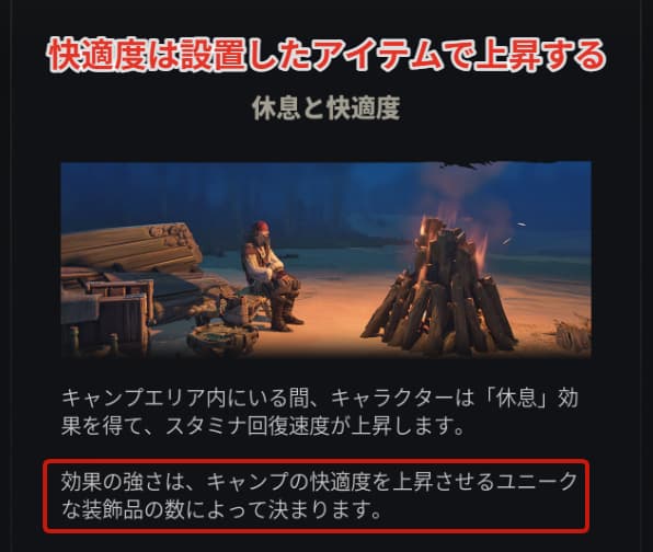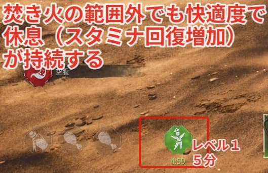 休息効果の焚き火範囲外に出た際の持続時間は快適度のレベルが影響していきます。