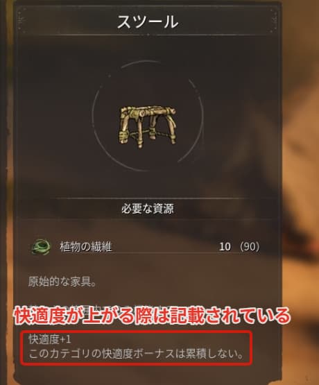 快適度の上がるアイテムは建築パネル欄で【快適度+○】と記載されています。