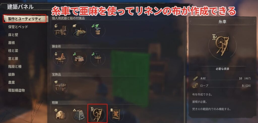 亜麻をリネンの布にするには糸車を屋根のある場所に設置すれば作成できるようになります。