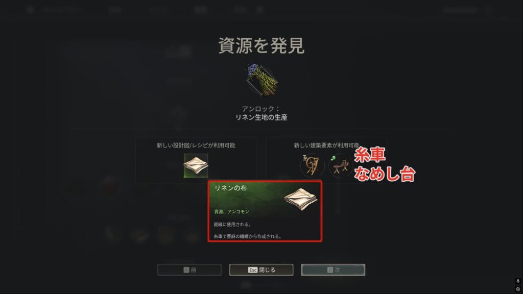 亜麻を初めて入手するとリネンの布のレシピと糸車・なめし台が設置できるようになります。