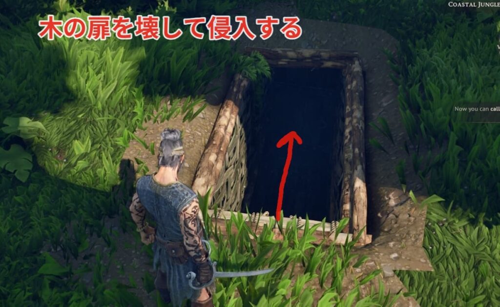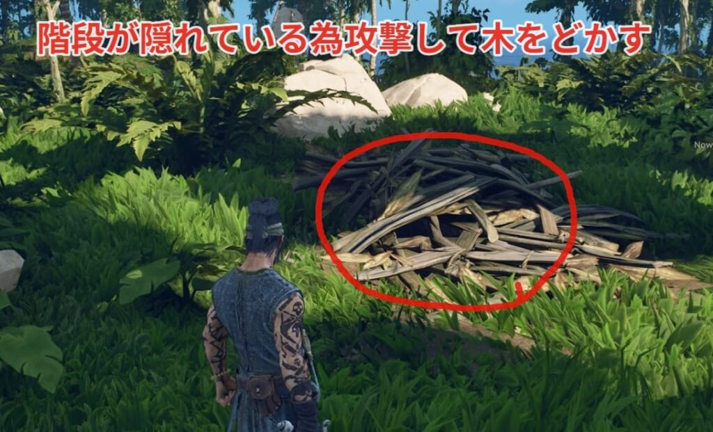 入口は木が大量に重なっている場所にあります。攻撃してどかしましょう。