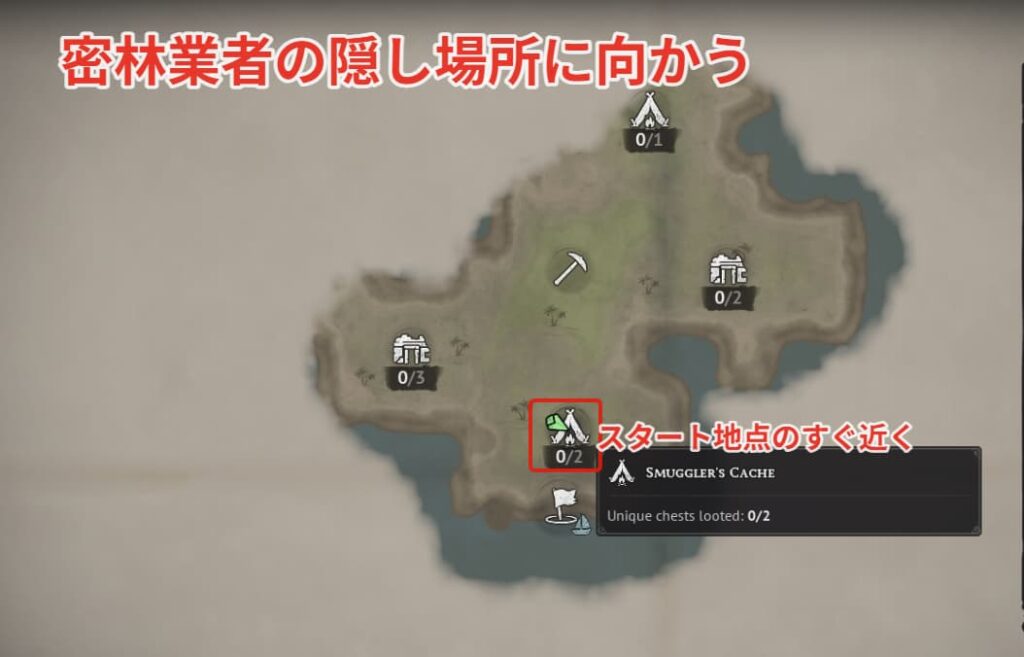 ゲーム開始直後に火薬を入手するにはスタート地点すぐ近くの密林業者の隠し場所に向かいましょう。
