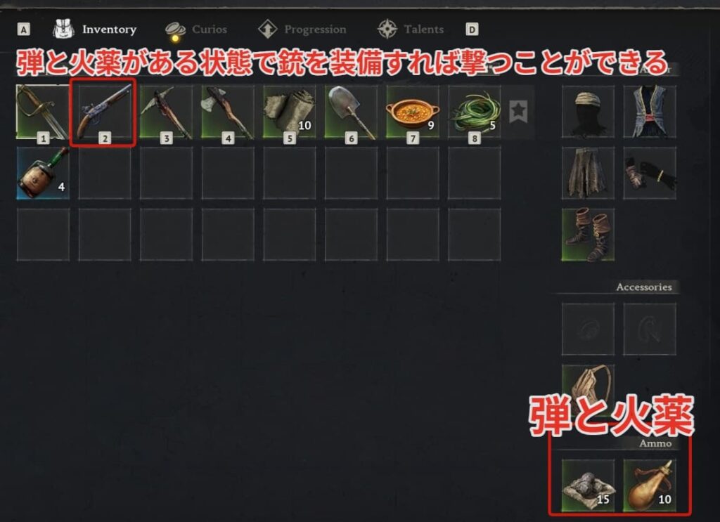 インベントリ欄で弾と火薬をセットした状態で初めて銃を撃つことができるようになります。