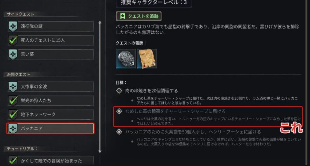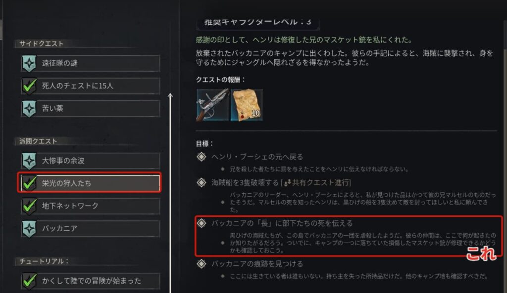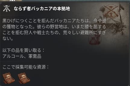 栄光の狩人たちを進めていき『バッカニアの「長」に部下たちの死を伝える』でマップ上にならず者バッカニアの本拠地が表示されます。