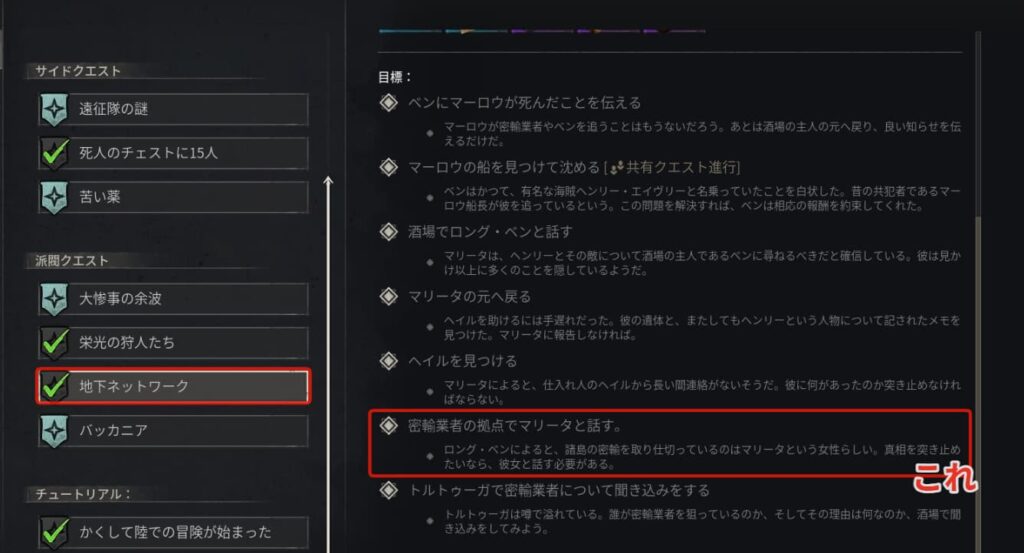 ポート・ロイヤル密林業者の本拠地に向かうにはトルトゥーガに到着後に発生する派閥クエスト【地下ネットワーク】を進めて行きましょう。