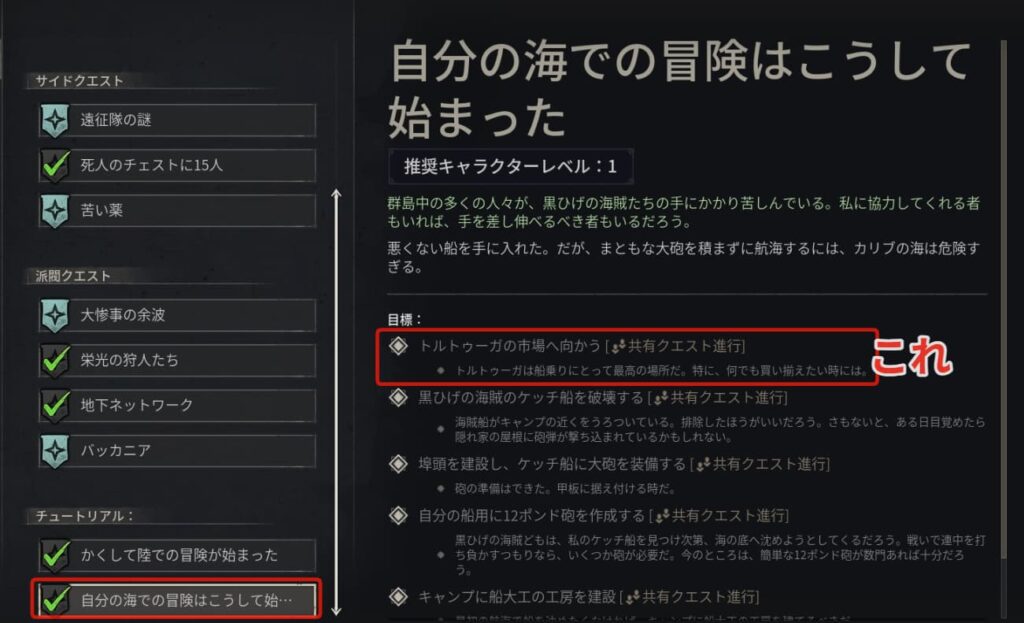 トルトゥーガに向かうには船を入手後に発生するチュートリアル【自分の海での冒険はこうして始まった】を進めて行きましょう。