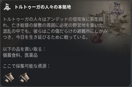 トルトゥーガの人々の本拠地の場所はならず者バッカニアの本拠地に到着後に発生する派閥クエスト【バッカニア】を進めて行きましょう。