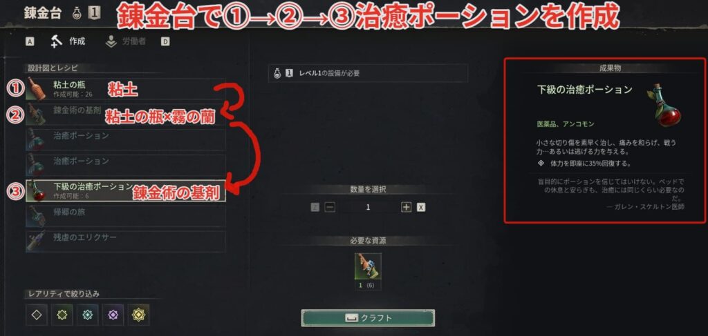錬金台で①粘土の瓶→②錬金術の基剤→③下級の治癒ポーションと作成することで回復できるポーションを作ることができます。