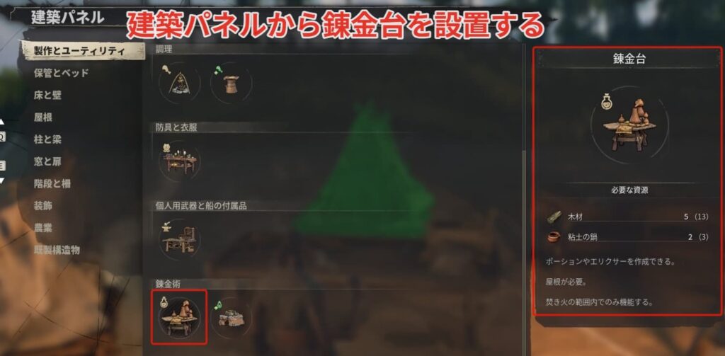 拠点に戻って建築パネルから錬金台を屋根のある家の中に設置しましょう。
