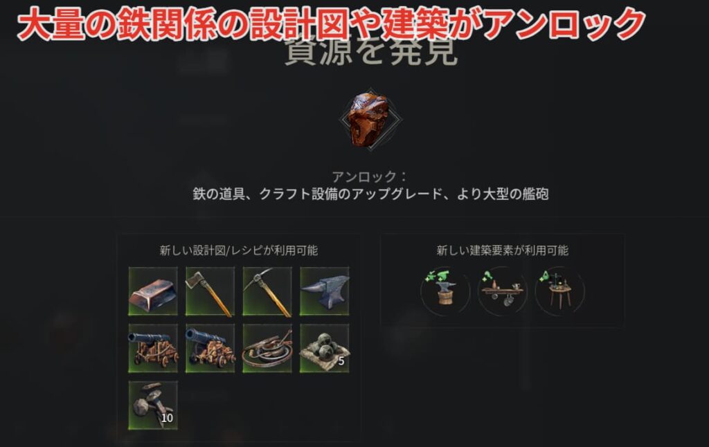 鉄鉱石が手に入ると大量に鉄関係の設計図や建築がアンロックされます。