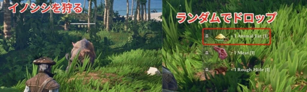 動物脂は島内にいるイノシシを狩るとランダムでドロップします。