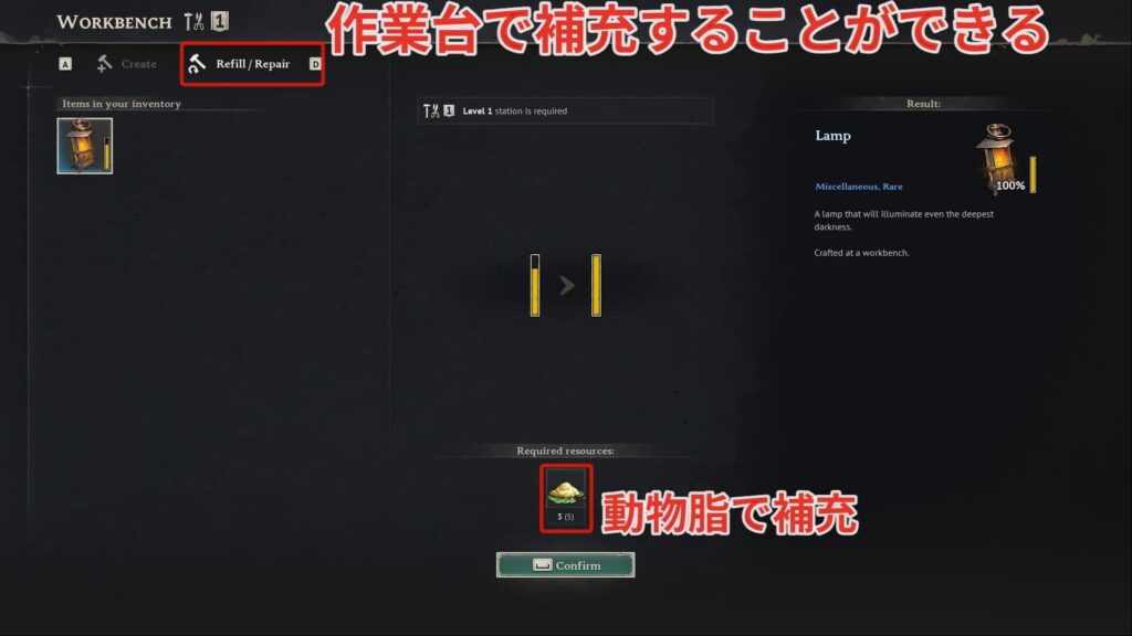 ランプの明かりは作業台の修理で補充することが可能です。