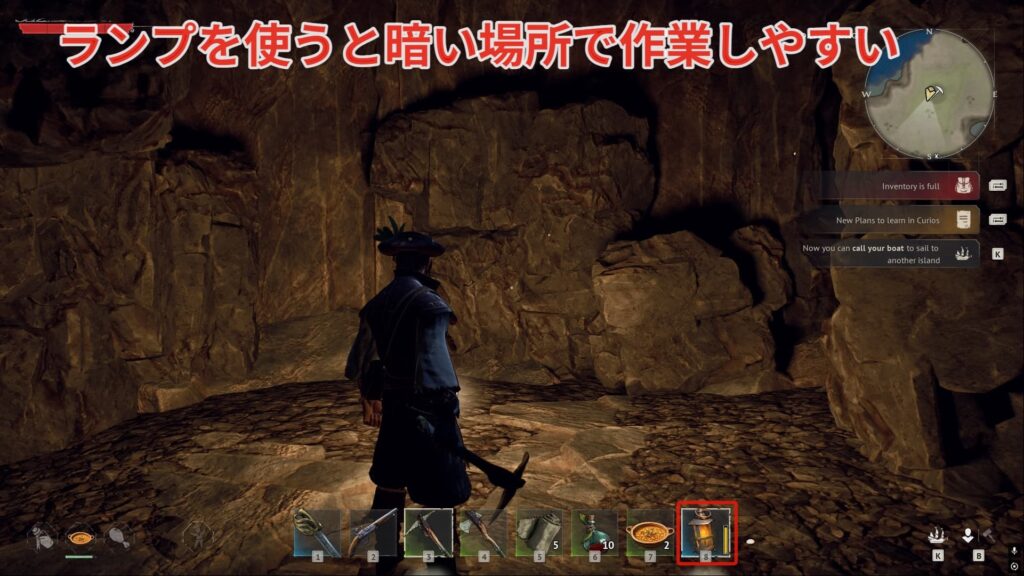 ランプは使用することで洞窟などの暗い場所を明るく照らすことができるので1つは用意しておきたい道具になります。