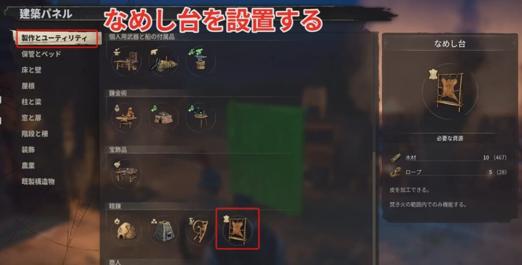 樹皮が集まったらなめし台を設置しましょう。