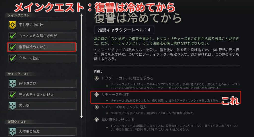 メインクエスト3つ目の【復讐は冷めてから】にリチャーズを倒すという目標があります。