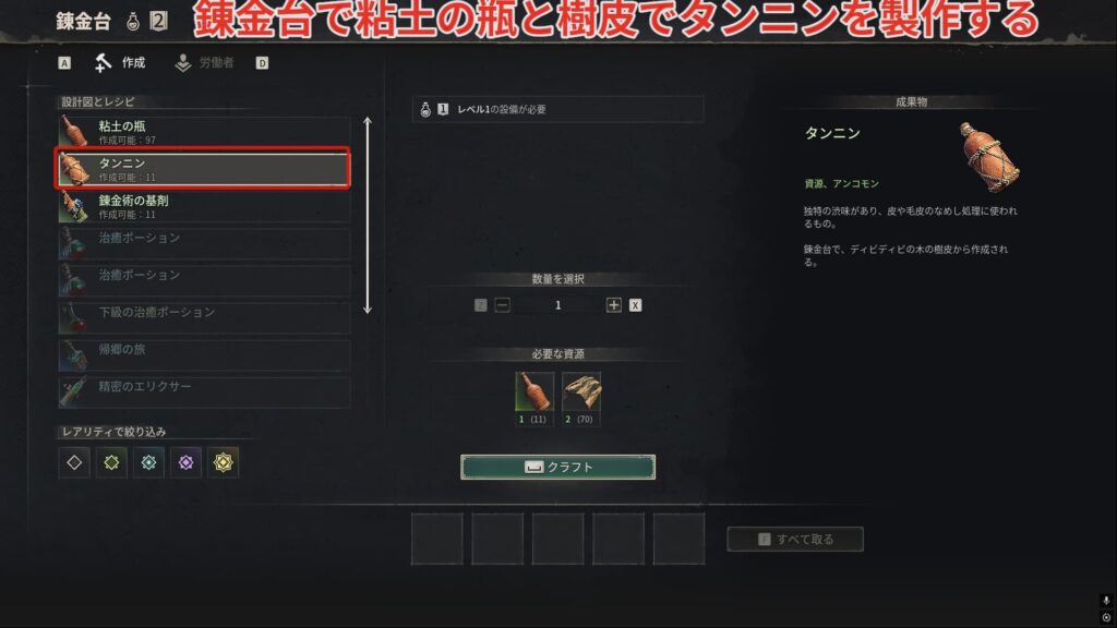 次に錬金台で粘土の瓶と樹皮を使ってタンニンを製作しましょう。