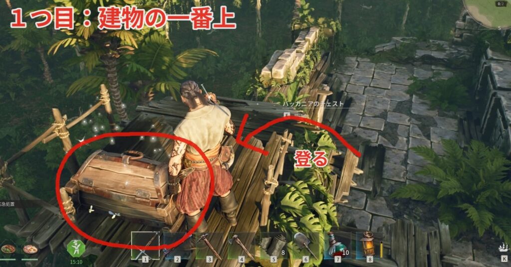 1つ目は建物の一番上です。登って宝箱まで向かいましょう。