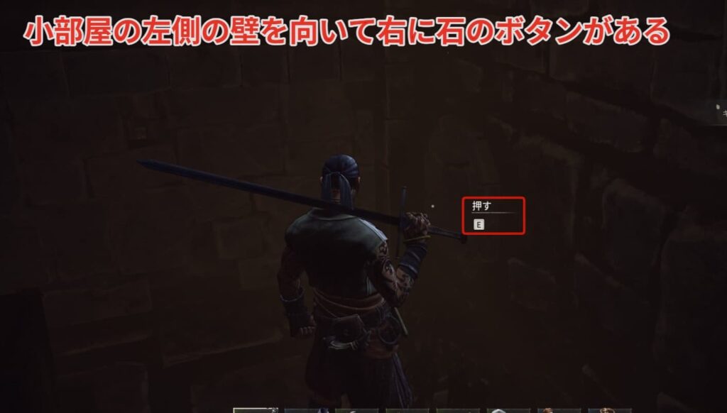 小部屋に入ったら左側の壁を向き、右を見ると石のボタンがあります。