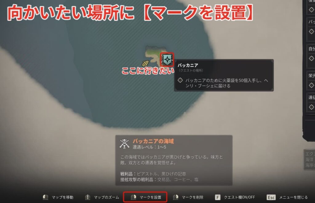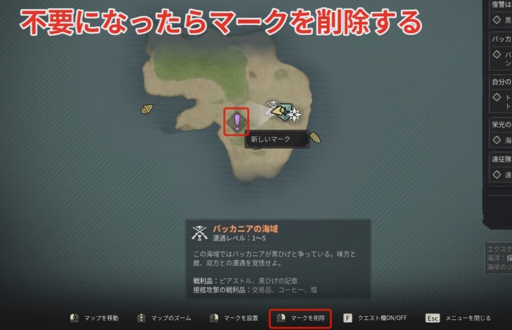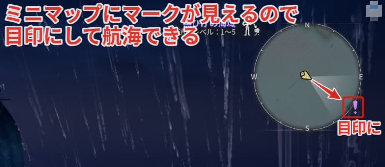 未知の島や領域のクエスト場所に向かう際にマークを設置するとミニマップに目印が表示されて航海が楽になります。