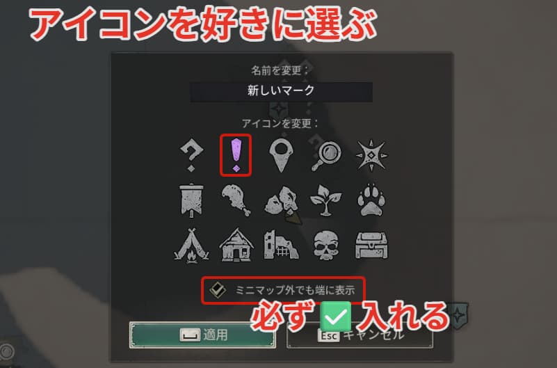 ミニマップ外でも端に表示に✔を入れるとミニマップに範囲外でもマークが向かうべき方向に表示され続けるので、いちいちマップを開かなくても目印に航海できます。