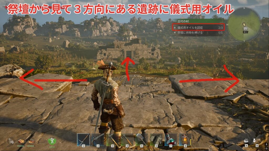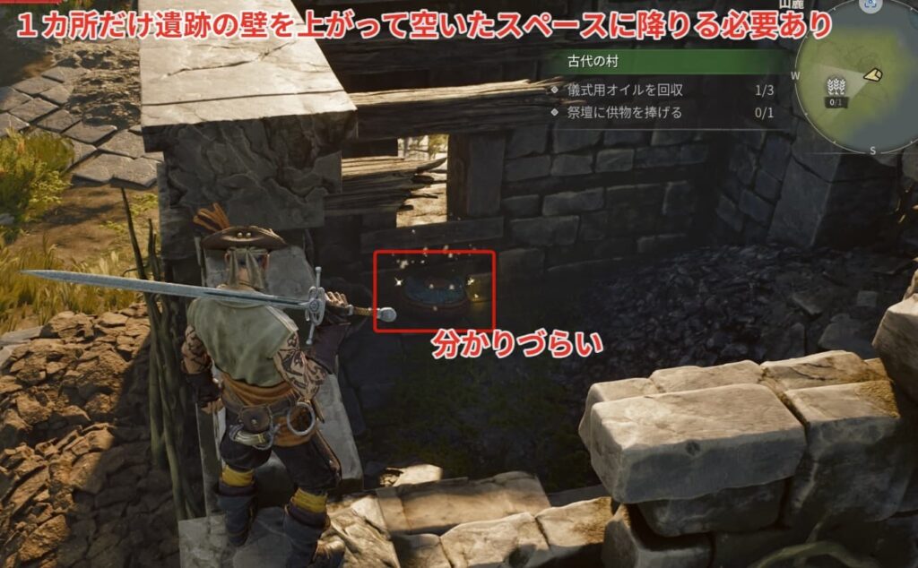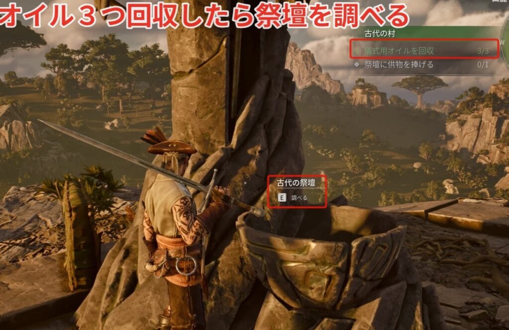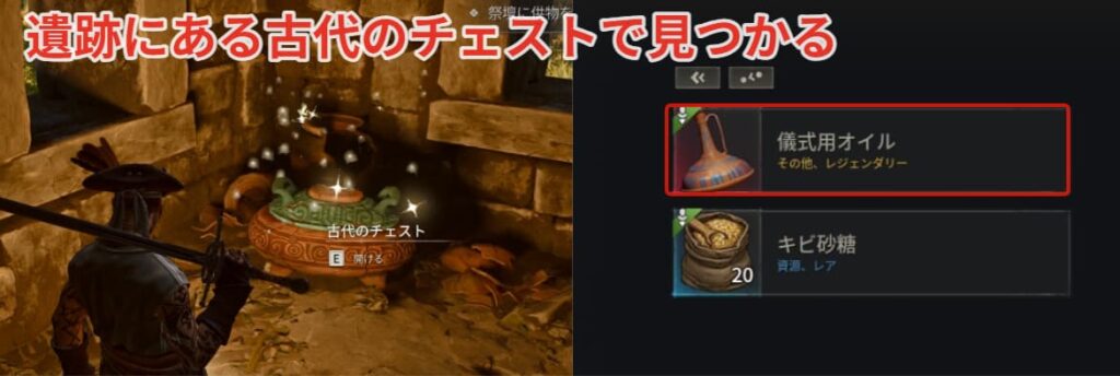 各遺跡に古代のチェストがあるので漁って儀式用オイルを拾っていきましょう。