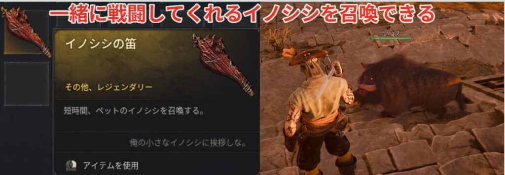Windroseでは【イノシシの笛】を手に入れると一緒に戦闘してくれるイノシシを召喚できるようになります。