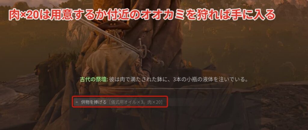 供物(儀式用オイル3・肉20)を捧げる必要があります。