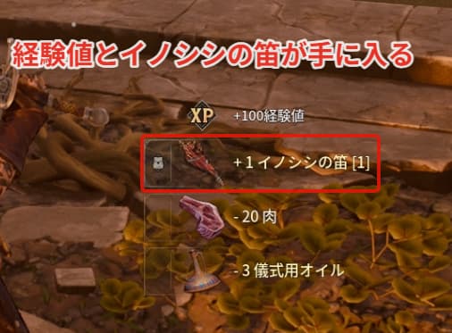 供物を捧げると経験値100とイノシシの笛が手に入ります。
