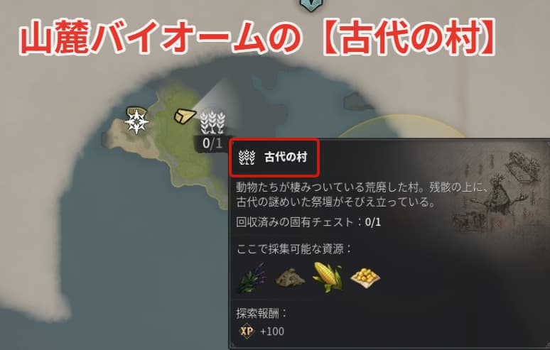 まずは山麓バイオームにある古代の村を見つけましょう。