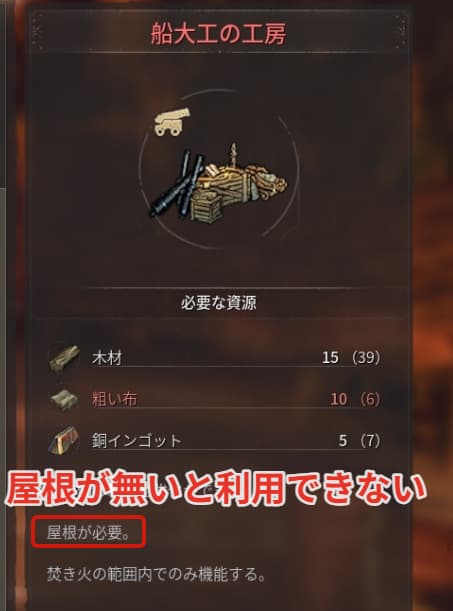 建築物には【屋根が必要】と表記されていて、屋外では利用できない物がいくつかあります。