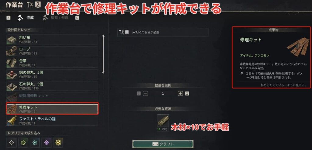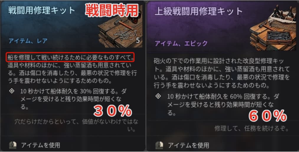 船を直す回復アイテムには『修理キット』と『戦闘用修理キット』の2種類があります。