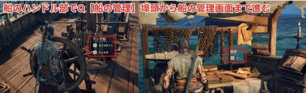 船のハンドル部で船の管理に向かうか埠頭から管理画面まで進みましょう。