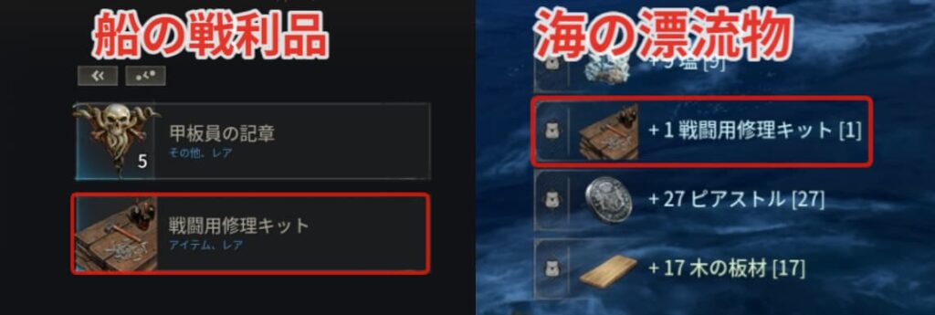 また、敵船を破壊した際の戦利品や海に浮いている漂流物からも修理キットが手に入ることがあります。