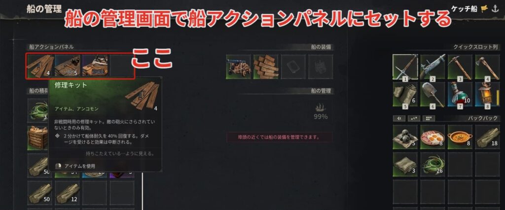 船の管理画面で左上にある船アクションパネルに各修理キットをセットしましょう。
